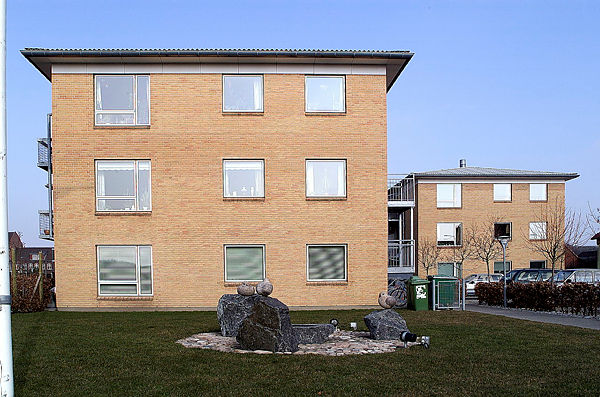 Bebyggelsen ligger tæt ved dagligvarecenter og togstation m.m.